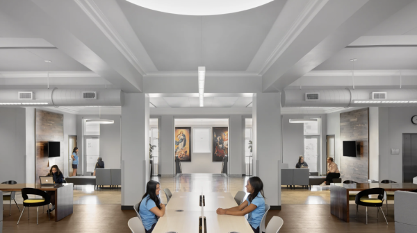 The third floor offers a more independent studying environment, with separate pods for girls to sit in when needing some privacy. With windows surrounding the entire commons lighting up the area, it is also a go to favorite for those wishing to collaborate at the large tables.
